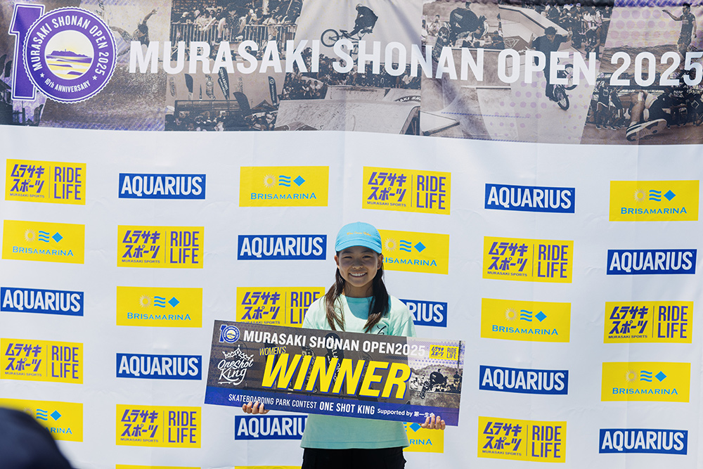 ラストはウォールでの「バックサイドノーズブラント180アウト」。わずかに揺らぎながらも最後までまとめ切り、ONE SHOT KING WOMEN's 初代王者の座に輝いた。